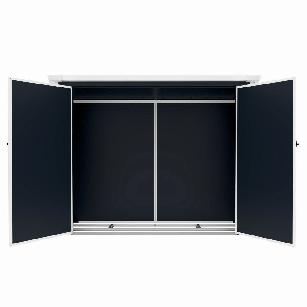 ConstrucÈ›ia solidă, ranforsată cu metal, asigură stabilitate È™i rezistență îndelungată. AcoperiÈ™ul robust oferă protecÈ›ie excelentă împotriva condiÈ›iilor meteorologice variate – de la ploi abundente È™i zăpadă până la vânt puternic È™i radiaÈ›ii solare. Accesul este simplu È™i comod datorită uÈ™ilor cu balamale, cu o lățime de 156 cm È™i o înălÈ›ime de 172 cm, dimensiuni ce permit manipularea confortabilă a obiectelor voluminoase.