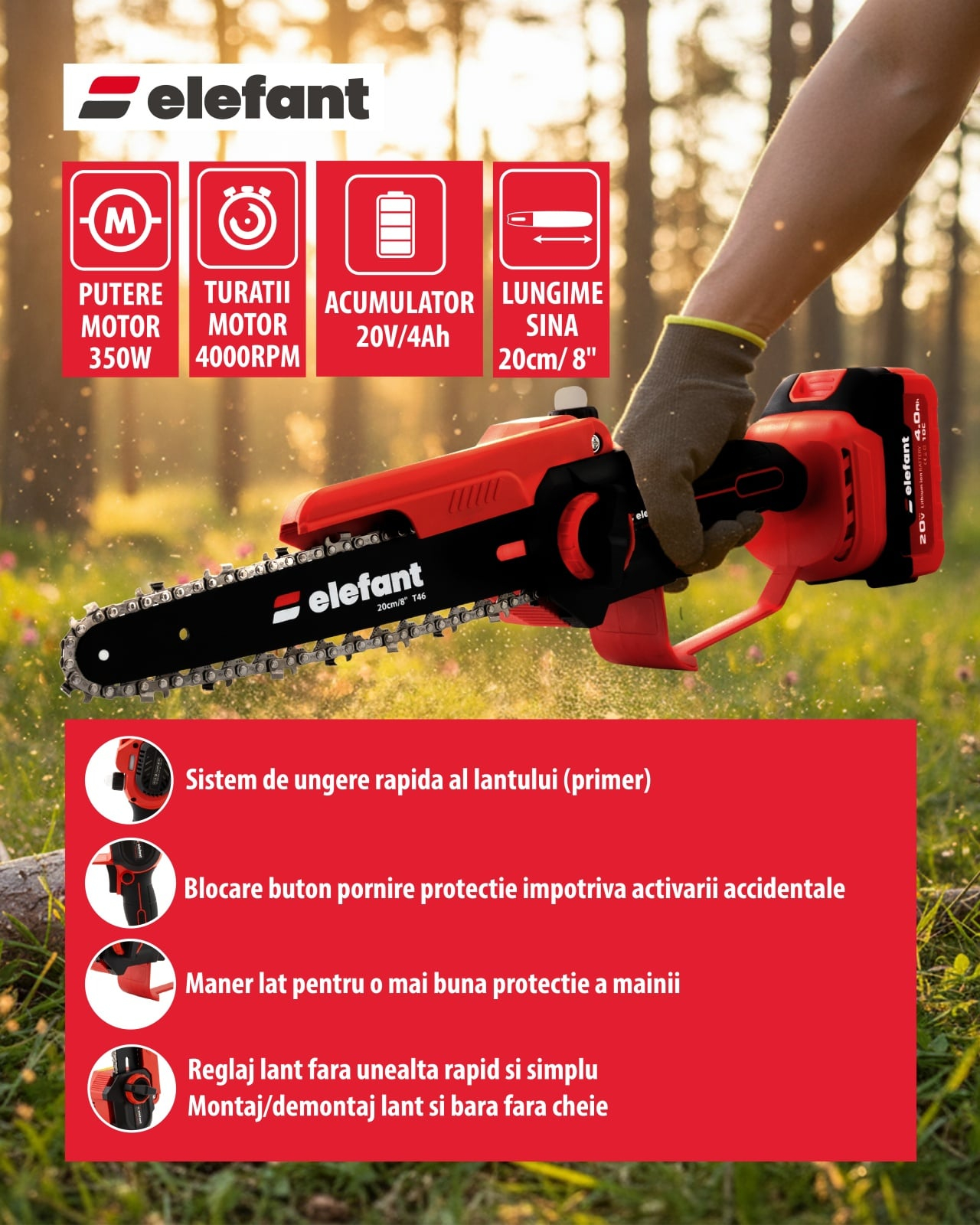Lama de 8 inch și lanțul cu 23 dinți, pas 1/4”, 46 pinteni și grosime 1.1 mm permit tăieri rapide și precise, cu un diametru maxim de tăiere de până la 200 mm. Viteza de rotație de 4000 rot/min contribuie la un ritm constant de lucru, chiar și în cazul ramurilor mai groase.