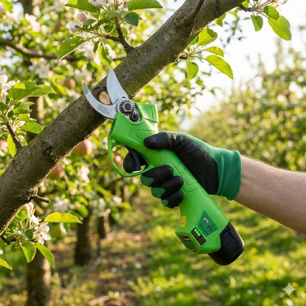 Foarfecă electrică Micul Fermier MF-MX1020-G01, 14.4V, motor brushless 670W, capacitate tăiere 25 mm. Ideală pentru pomi fructiferi, viță de vie și arbuști. Ușoară, precisă și eficientă pentru grădinărit.