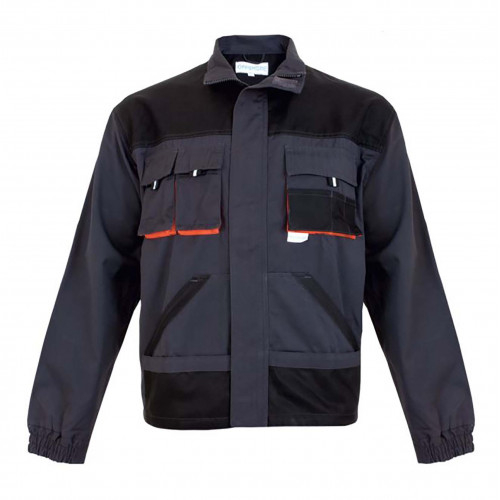 Jacheta de lucru, inchisa frontal cu fermoar, acoperit cu fenta, 4 buzunare frontale (2 la piept cu pliu de larghete si 2 laterale), inchise cu velcro, platca frontala la partea superioara de culore neagra, maneci drepte terminate cu manseta elastica.