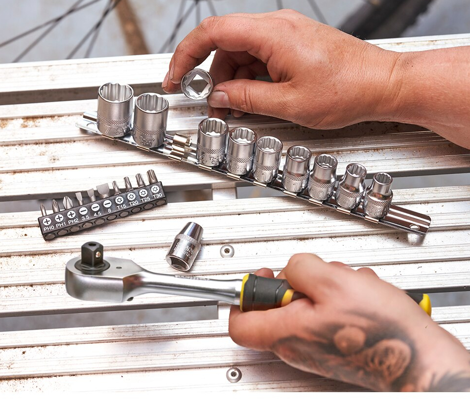 22 de piese 3/8”: 1 clichet cu 120 de dinţi, 10 chei tubulare poligonale (8-9-10-11-12-13-14-15-16-17 mm), 1 adaptor 3/8" biți 1/4", 10 biți 1/4” (Ph.0-1-2, lat 3,5-4,5-8 - TT15-TT20-TT25-TT30)