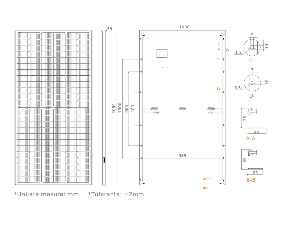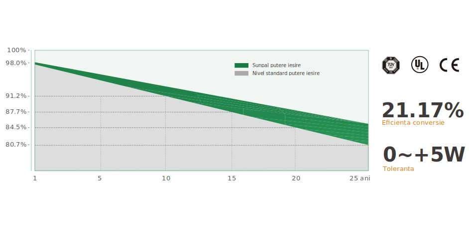*** NOCT (Nominal Operating Cell Temperature/Temperatura nominala de funcționare a celulei): Iradiere 800W/m2, Temperatura ambient 20°C, Spectre la AM1.5, Vant la 1m/s