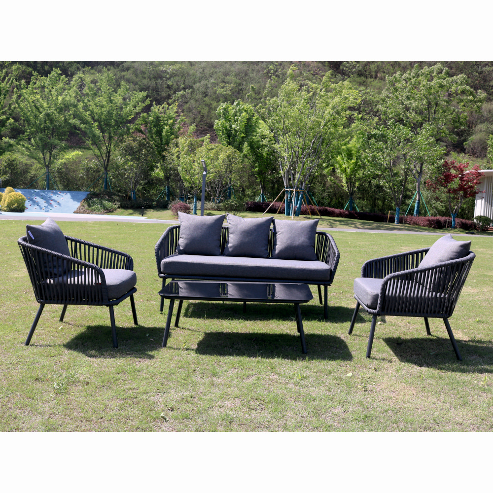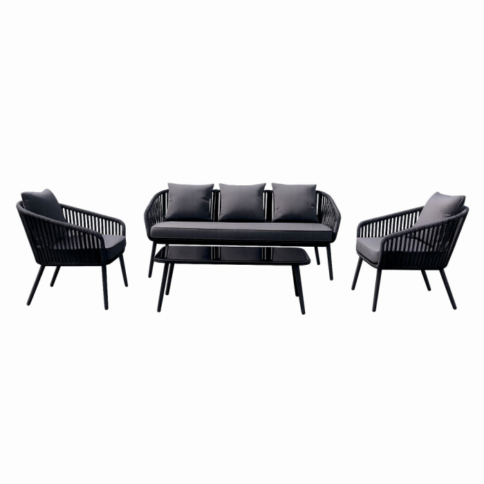 Completează-ți terasa sau grădina cu un set rafinat de mobilier de exterior, compus din patru piese esențiale: o masă practică, două fotolii spațioase și o canapea confortabilă.